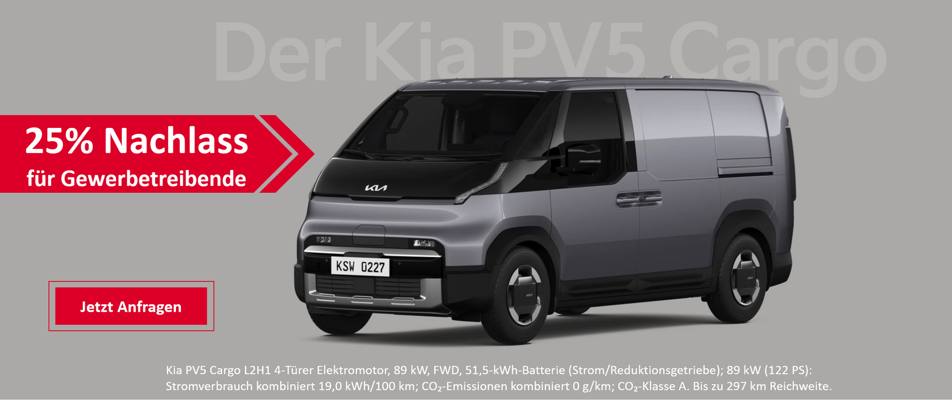 Kia PV5 Cargo L2H1 (120 kW/163 PS): Stromverbrauch kombiniert 20,1 kWh/100 km. CO₂-Emissionen kombiniert 0 g/km. CO₂- Klasse A. Abbildung zeigt kostenpflichtige Sonderausstattung.